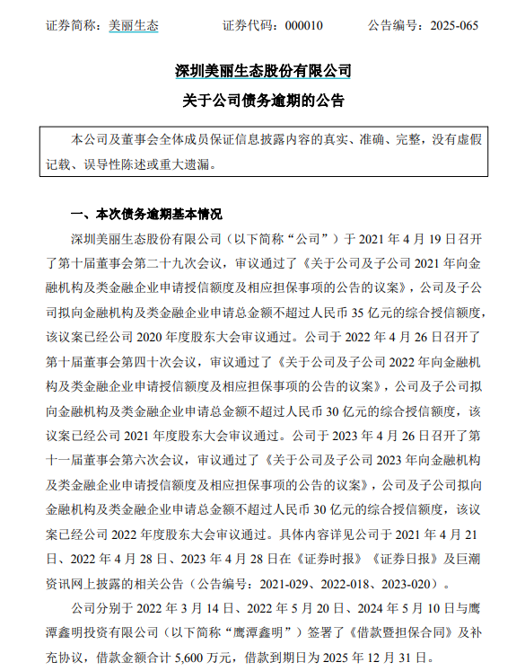 【大河财立方消息】10月10日,深圳美丽生态(000010)股份有限公司(证券简称:美丽生态)公告,近日,收到鹰潭鑫明投资有限公司的债务清偿通知书及提前还款通知书,因未能在指定还款期限还款,公司构成债务逾期。