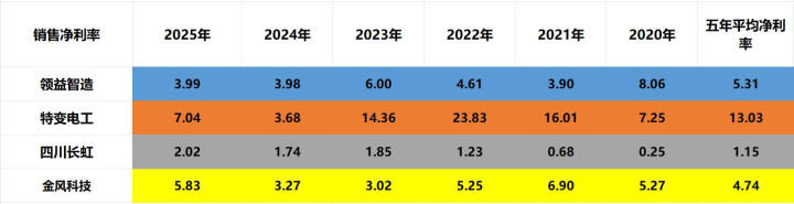 盈利能力:特变电工>金风科技>领益智造>四川长虹